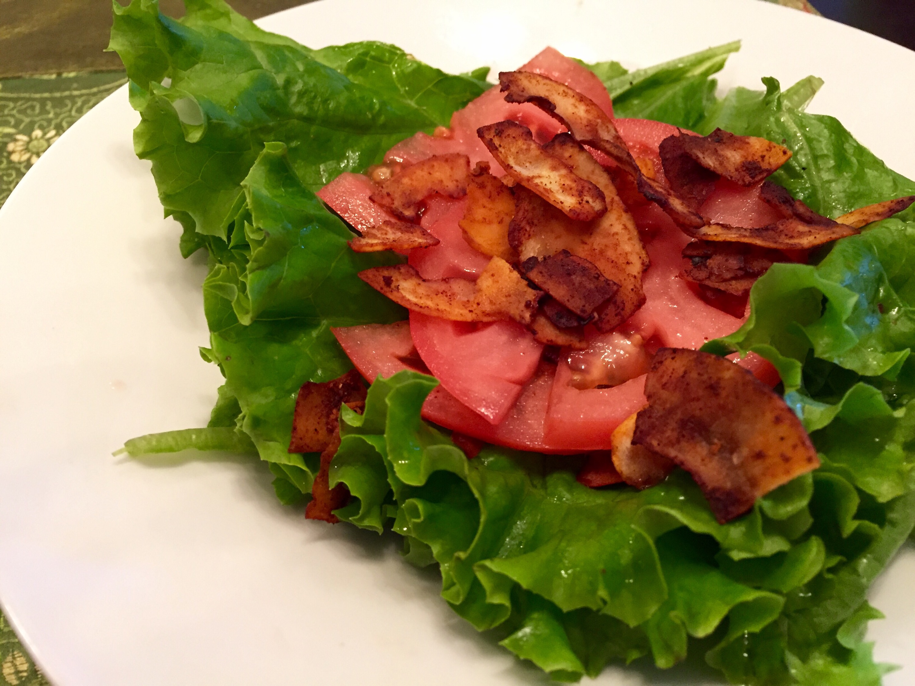 I decided to add a twist to the traditional bacon lettuce tomato (BLT) sandwich. I made a coconut BLT lettuce wrap! It was very tasty! The coconut bacon was good but I think it could be better. Next time I will adjust my ingredient measurements. Not bad though for a first try.